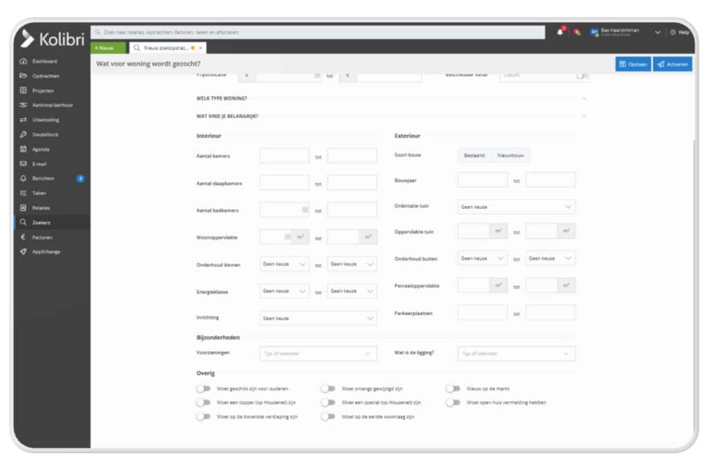 Wanneer een websitebezoeker van jouw Kolibri website een eigen zoekprofiel aanmaakt, wordt deze in Kolibri CRM automatisch gekoppeld aan de lijst met zoekers. Zo automatiseer je het gehele proces, maar lever je wel gepersonaliseerde zoekresultaten.