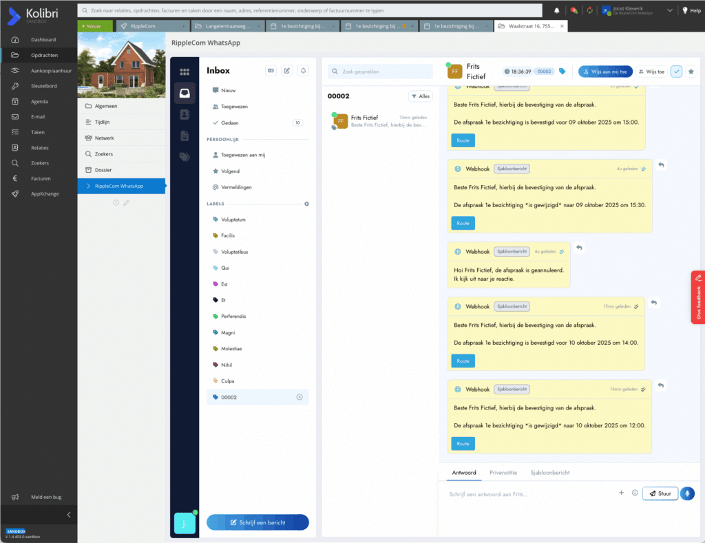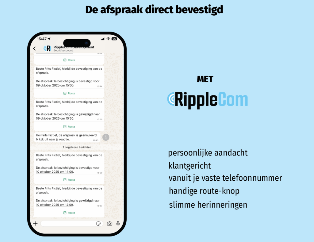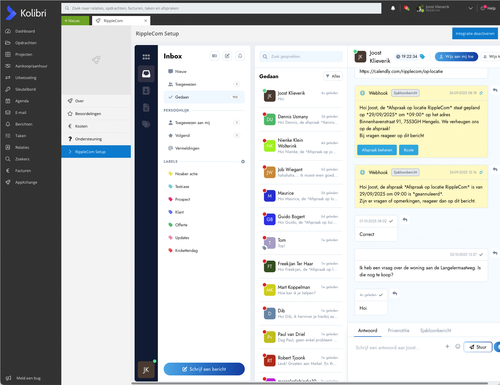 RippleCom WhatsApp is de professionele team inbox voor makelaars, volledig geïntegreerd in Kolibri. De integratie stuurt automatisch bevestigingen en slimme herinneringen voor bezichtigingen rechtstreeks vanuit je Kolibri agenda. Bezoekers worden perfect voorbereid en arriveren op tijd op de juiste locatie.