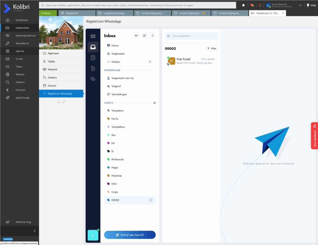 Alle WhatsApp gesprekken worden gekoppeld aan het juiste object in Kolibri. Via het dashboard zie je direct alle actieve communicatie per woning. Medewerkers kunnen gesprekken aan collega’s toewijzen en werken samen vanuit dezelfde inbox. De volledige gesprekshistorie blijft altijd beschikbaar voor het hele team.